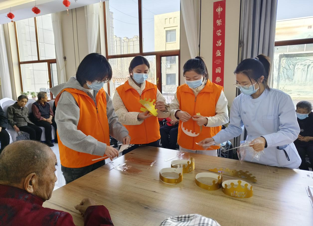 在活动中,党员们与养老服务中心工作人员一同为部分老人庆祝生日,亲手制作生日帽,齐唱生日歌,温馨的氛围感染了在场的每一个人。恰逢“三八”国际妇女节,党员们还为院内的女性长者送上红色围巾,表达敬意与祝福。随后,学生代表献上歌曲《送你一朵小红花》,将现场气氛推向高潮。