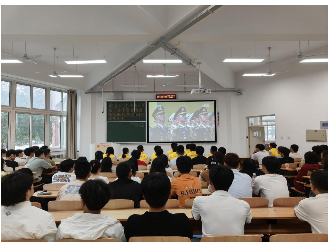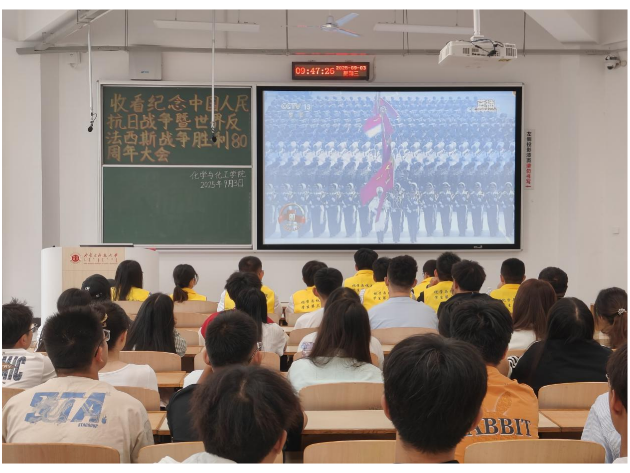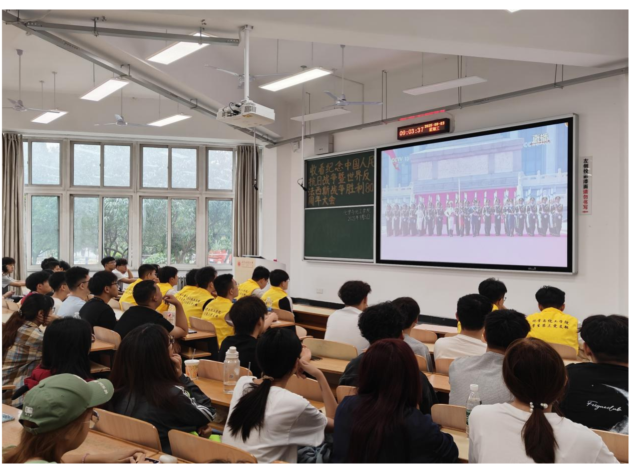 为铭记历史,致敬英雄,缅怀革命先烈,弘扬伟大抗战精神,增强师生的民族自豪感与使命感,9月3日上午9时,化学与化工学院学生第三党支部全体党员及入党积极分子于二教A103进行“收看纪念中国人民抗日战争暨世界反法西斯战争胜利80周年大会”。