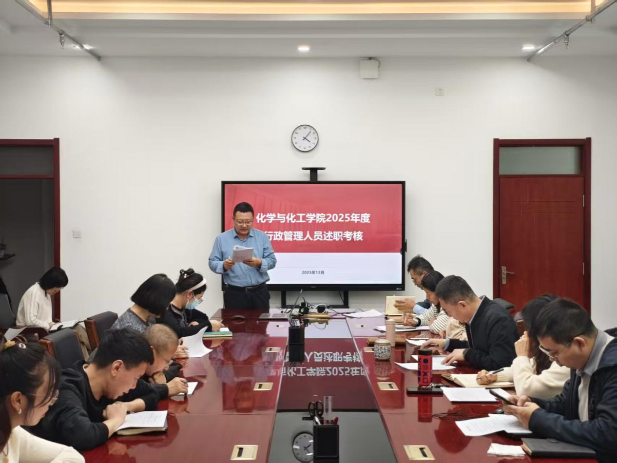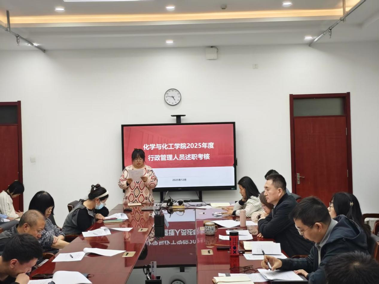 为系统总结年度工作成效,持续提升学院治理效能与管理水平,化学与化工学院于12月17日在逸夫楼E202会议室组织召开2025年度行政管理人员述职评议会议。学院党委书记主持会议,学院领导班子成员及教师代表共同参会。