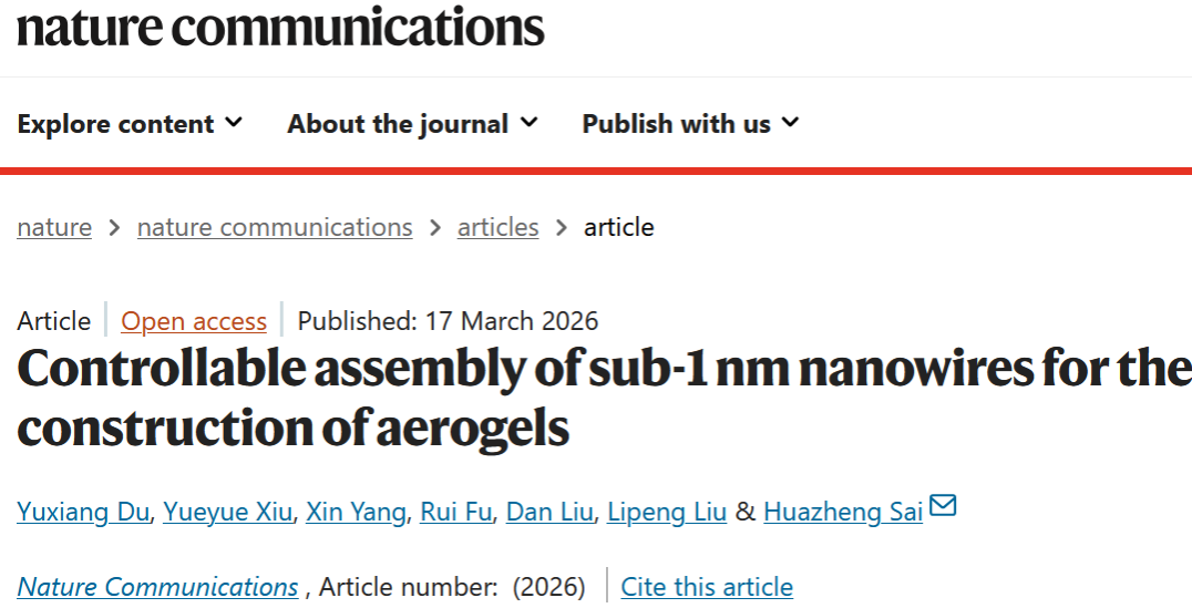 近日,我院赛华征教授团队在稀土基亚纳米线气凝胶可控构筑领域取得新突破,相关成果“Controllable assembly of sub-1 nm nanowires for the construction of aerogels”发表于综合性国际顶级期刊《Nature Communications》(DOI: 10.1038/s41467-026-70713-8)。赛华征教授为论文的独立通讯作者,硕士研究生杜玉祥为论文第一作者,内蒙古科技大学为唯一完成单位。