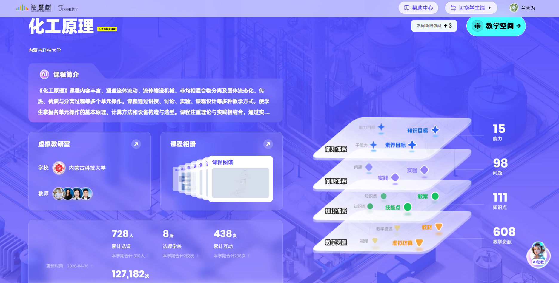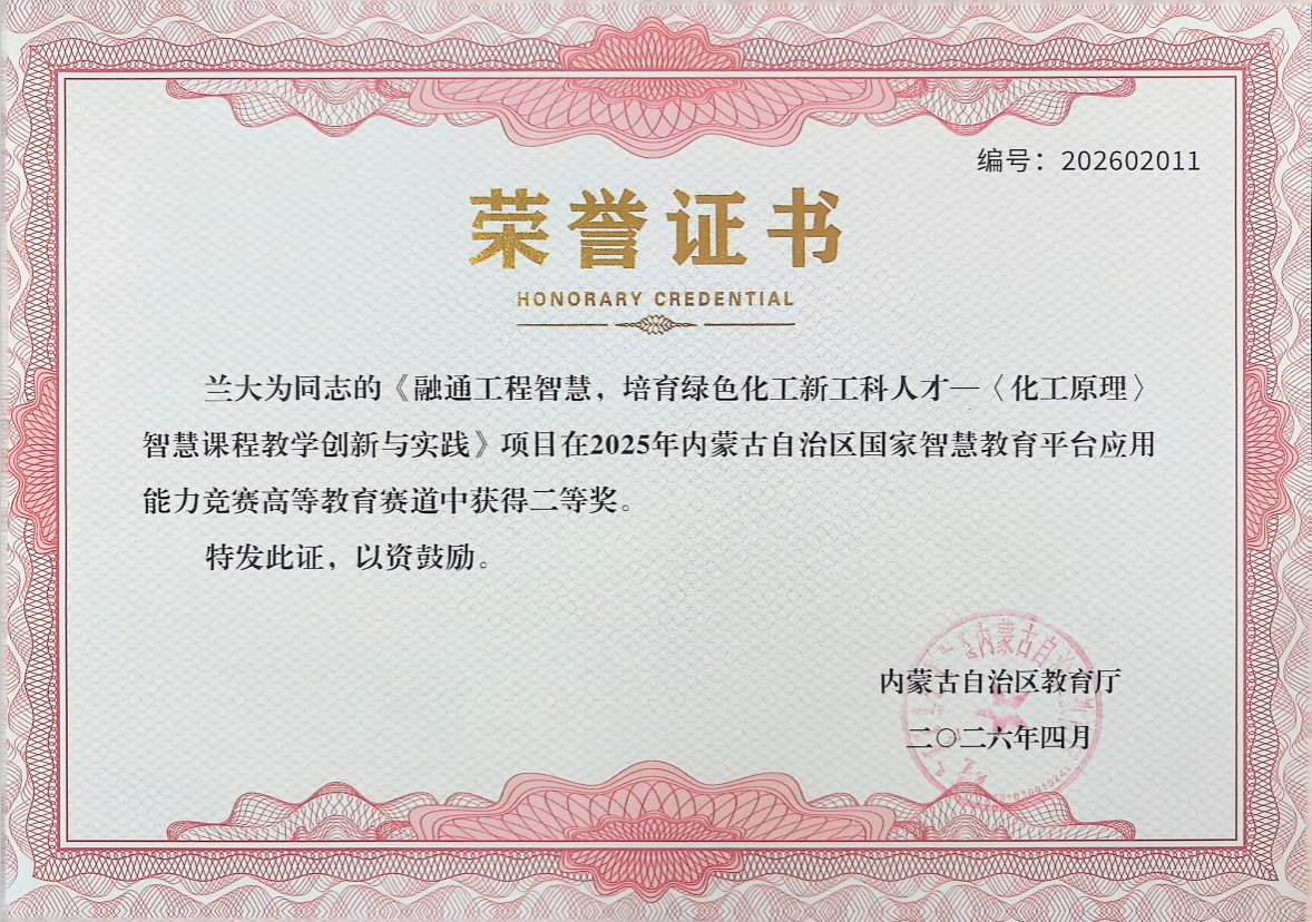近年来,国家持续推进人工智能赋能教育教学改革,在此背景下,我院教师兰大为在相关领域成果丰硕。2024年以来,兰大为及团队成员持续推进《化工原理》及相关课程的智慧课程建设,不断完善线上线下融合教学体系,系统建成涵盖课程资源、案例库、习题库、知识图谱、过程评价等功能的智慧教学平台,实现教学资源数字化、学习过程可视化和教学管理精准化。依托课程平台建设和育人成果,荣获首届内蒙古自治区国家智慧教育平台应用能力竞赛二等奖,人工智能教学案例成功入选自治区优秀案例库。在内蒙古自治区高等教育学会第七届理事会第二次会员代表大会上受到自治区高等教育学会表彰。系列成果充分体现了我院教师主动拥抱教育数字化变革、积极探索智慧教学新路径的责任担当与专业实力。