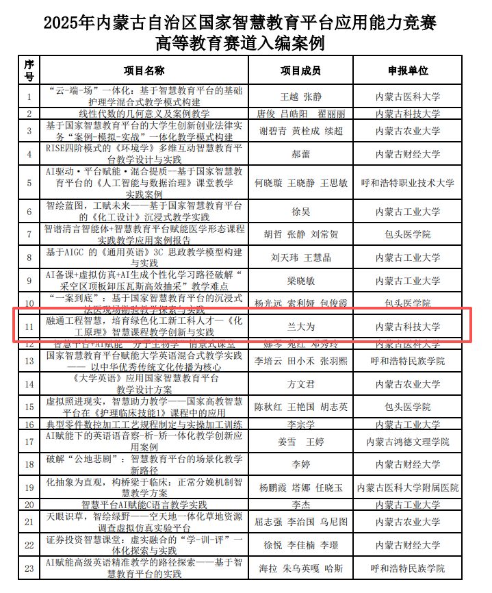 4月26日,第六届内蒙古自治区高校教师教学创新大赛暨第六届全国高校教师教学创新大赛内蒙古赛区选拔赛在内蒙古医科大学圆满落幕。我院教师兰大为在本届大赛中表现优异,凭借《化工原理》课程教学创新成果,荣获新增设的人工智能赛道一等奖(第一名),充分展示了学院在教育教学改革和人工智能赋能人才培养方面取得的积极成效。