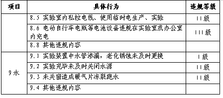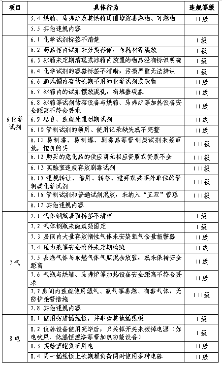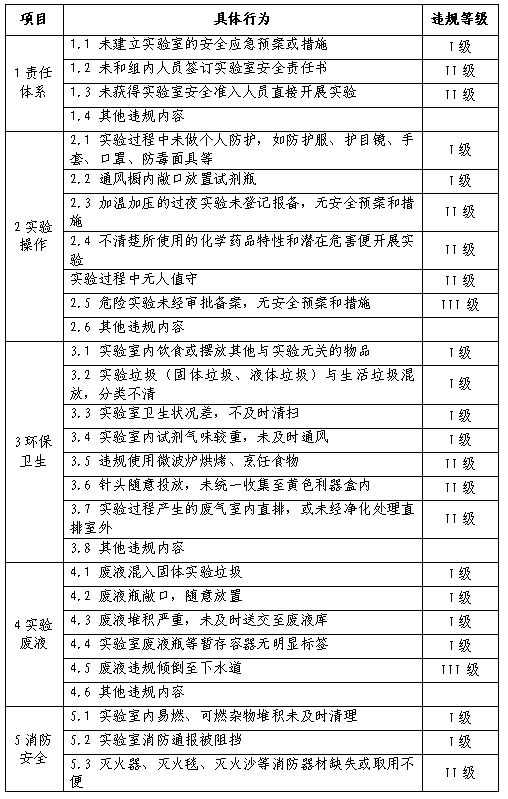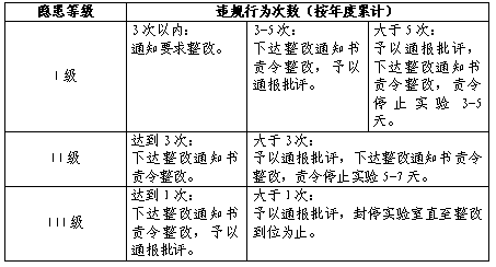 第七条对照附表中列举的常见实验室安全隐患违规行为,经学院检查发现或他人举报,向实验室负责人告知违规内容,并由其签字确认。对实验室的违规行为根据隐患等级和实际情况予以处理: